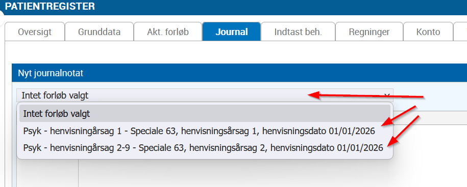 I dropdown-boksen kan man vælge det forløb, man ønsker at skrive et journalnotat om. Hvis der kun er ét aktivt forløb, vælger systemet dette automatisk.
